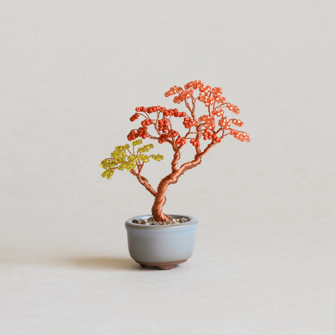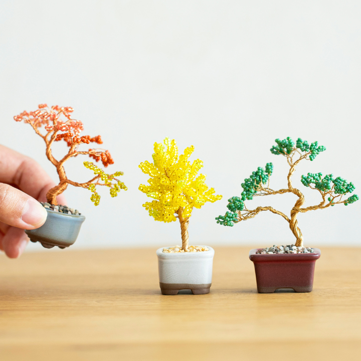 ひとつひとつビーズを手で通して出来上がったミニ盆栽は、思い入れもひとしお。愛着がわく可愛さです。