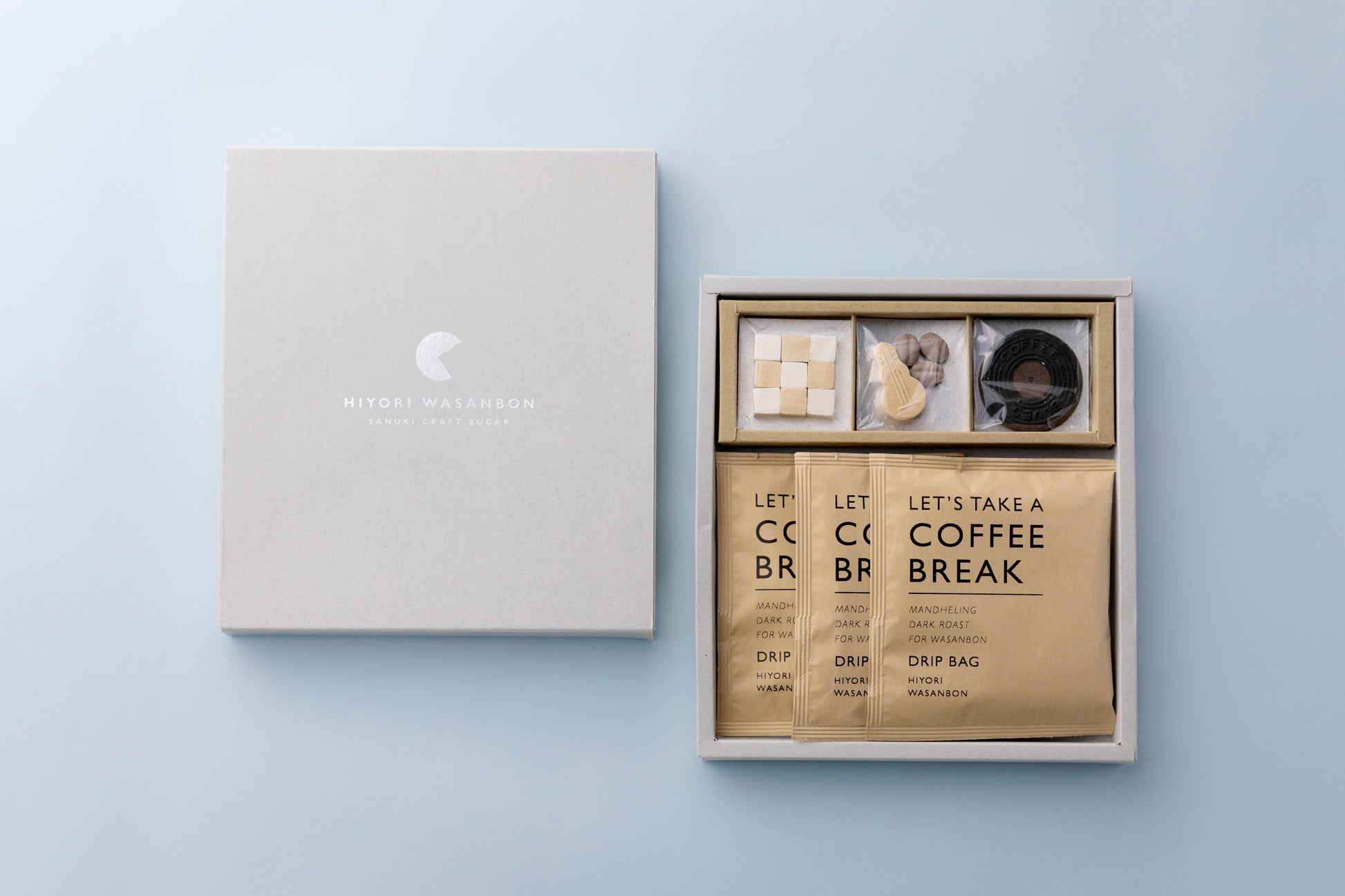 瀬戸内の“いい日”を、コーヒーの香りと一緒に贈れるギフトセット。香川・高松の「HIYORI WASANBON」がつくる和三盆3個と、ドリップバッグ3袋をギフトBOXに詰め合わせました。和三盆は、職人が手彫りした菓子木型でかたちを生み出すもの。受け継がれてきた技が、小さな一粒に宿っています。パッと目を引く和三盆の意匠とマンデリンの深いコク。甘さの余韻にコーヒーの厚みが重なって、いつもの一杯が少しだけ特別になります。