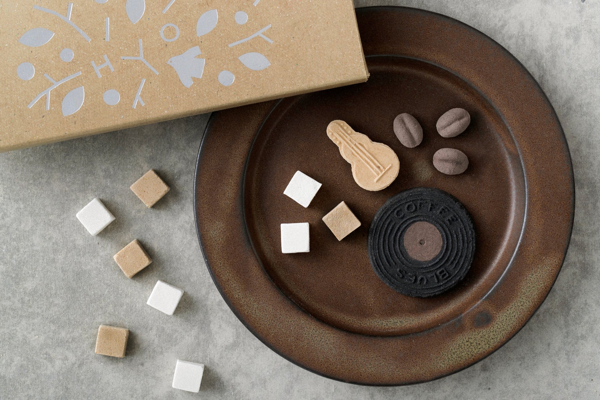 和三盆は3個入り。従来の和三盆のイメージを軽やかに更新する、音楽とコーヒーのモチーフが散りばめられています。ギターの弦やレコードの溝まで丁寧に彫られた意匠は、木型職人の技術があってこそ。愛らしい見た目に、思わず会話が生まれます。
