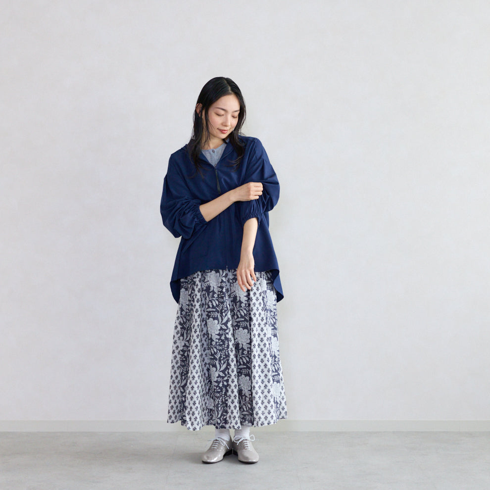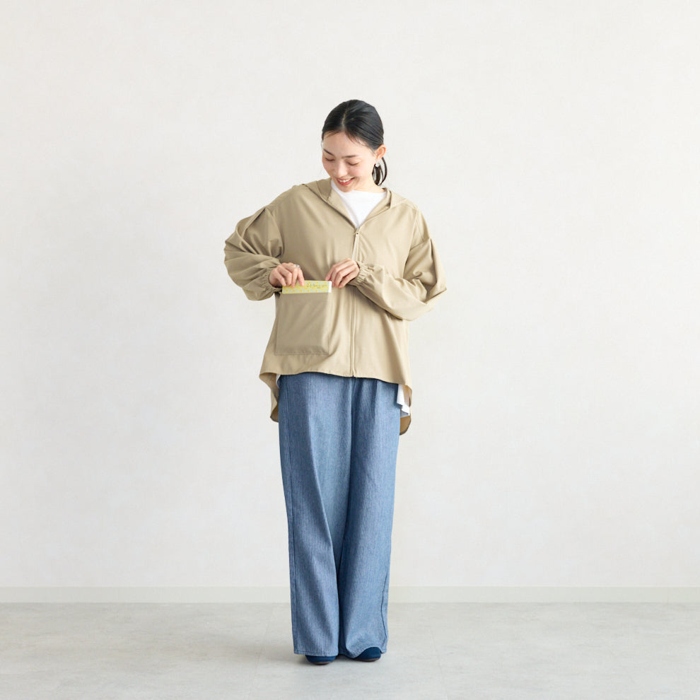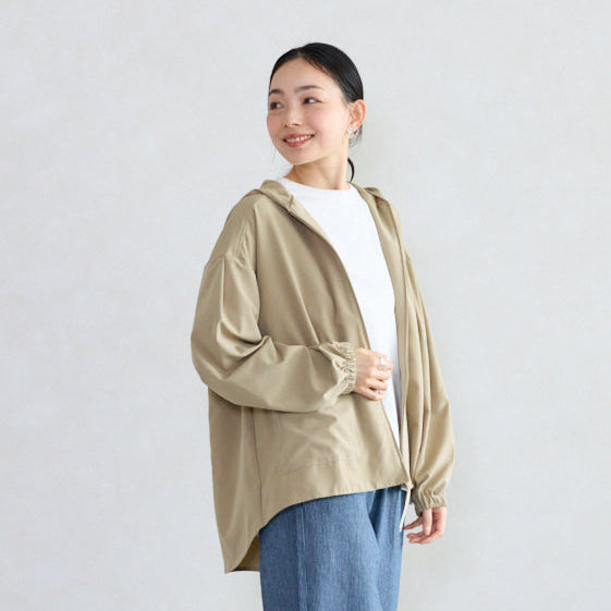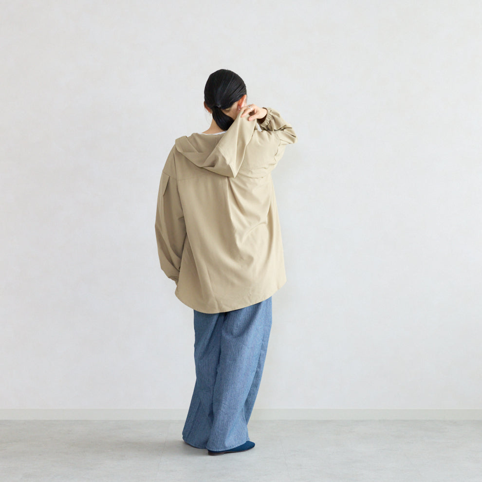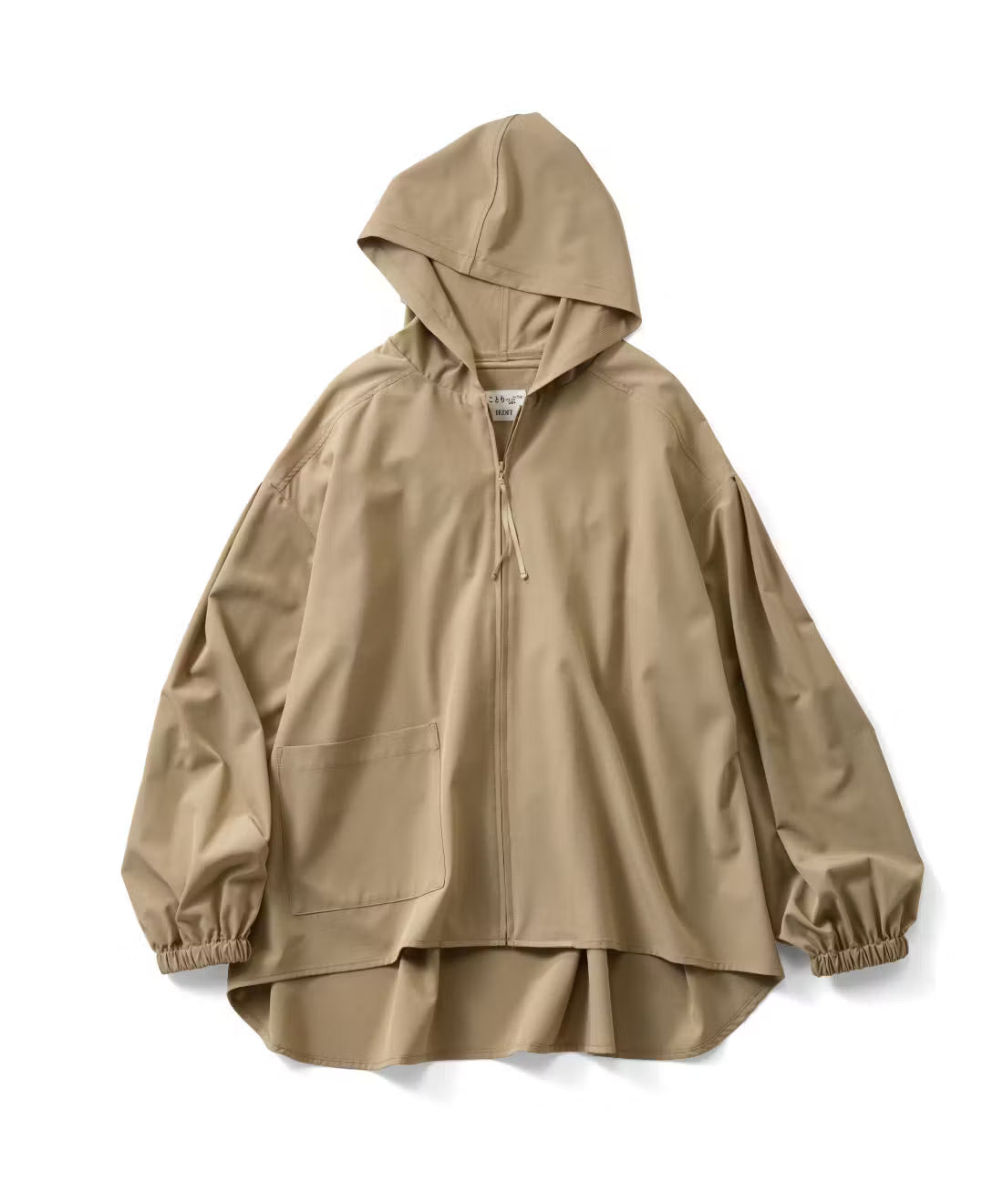 ゆとりのある大きめフードや、袖や背中のタックなど、女性らしいディテールがふんわりやさしい印象を演出。