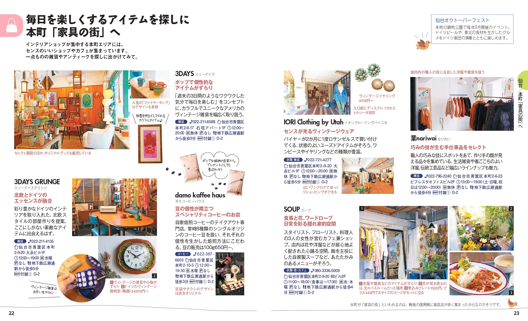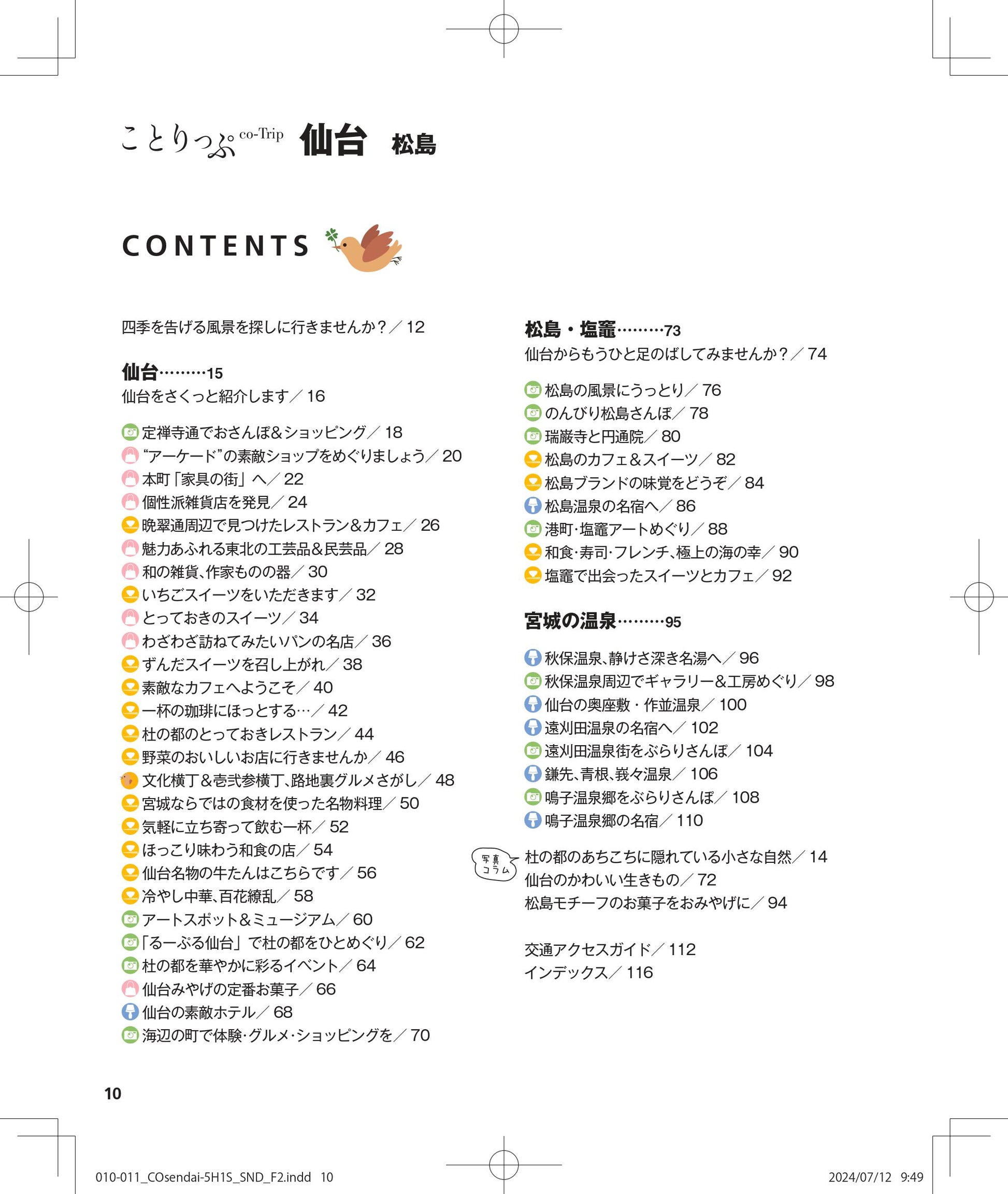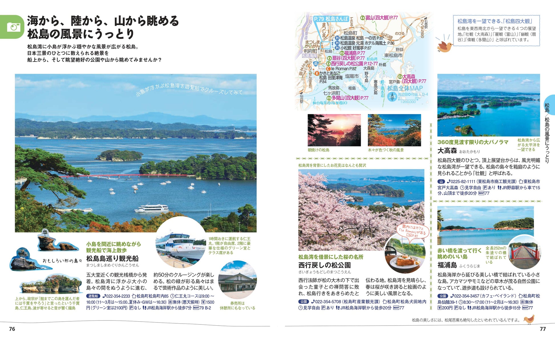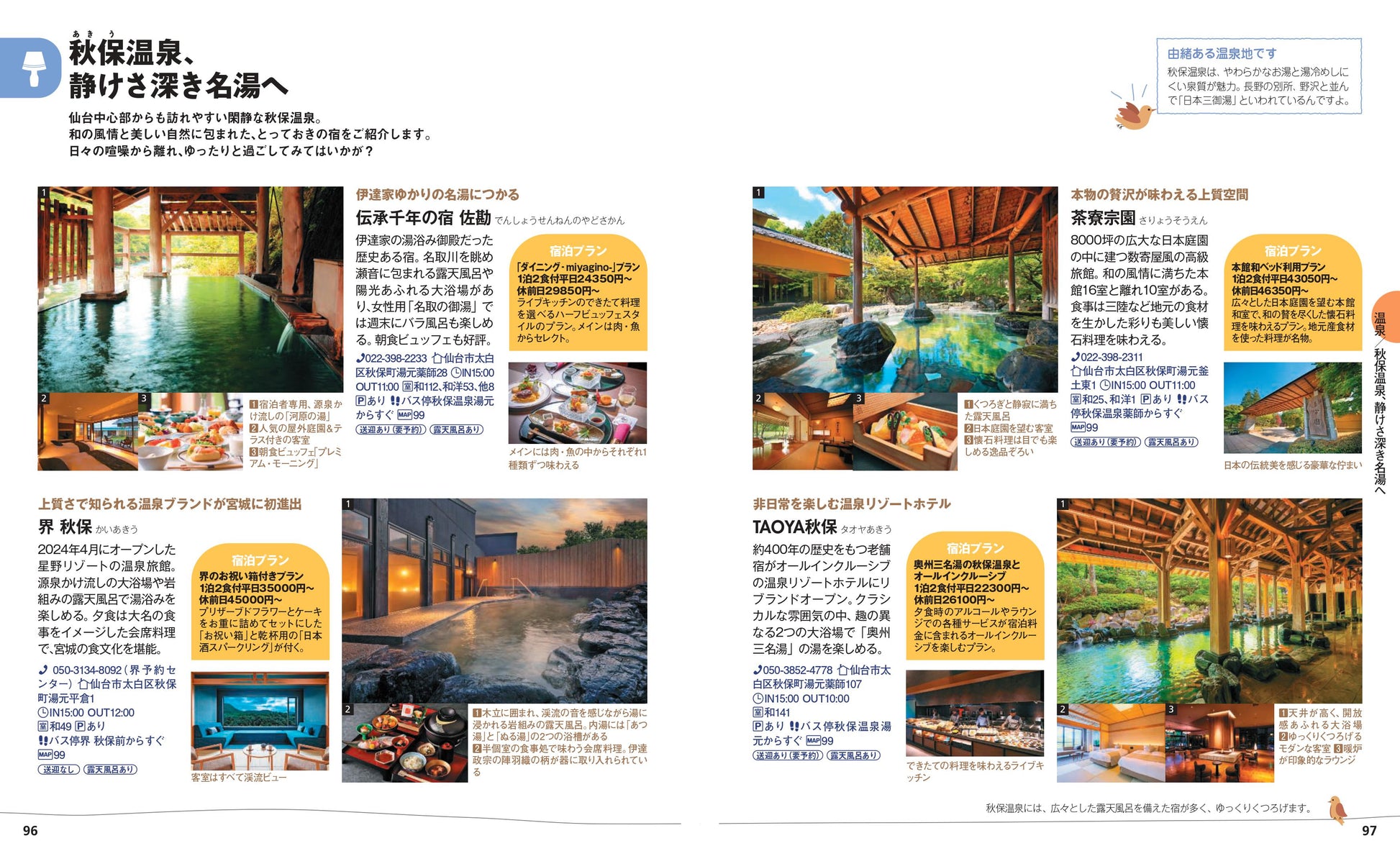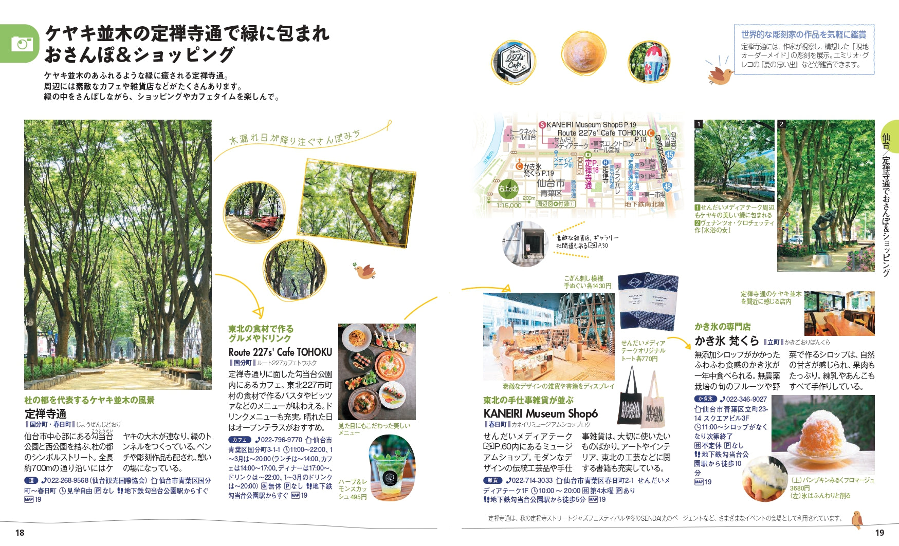 「杜の都」と呼ばれる仙台中心部には、広瀬川や通りにあるイチョウやケヤキなどの自然を感じながら、東北ならではのクラフト探し、地元グルメや地元の素材を使用するごはん、スイーツなどをいただきましょう。仙台からひと足のばして、緑の小島が浮かぶ絶景の松島を眺めたり、伊達政宗ゆかりの地での史跡めぐりもおすすめ。仙台周辺にある秋保・作並温泉や泉質が豊富な鳴子温泉郷で、情緒ある町を散策し名湯にも存分に浸かって。