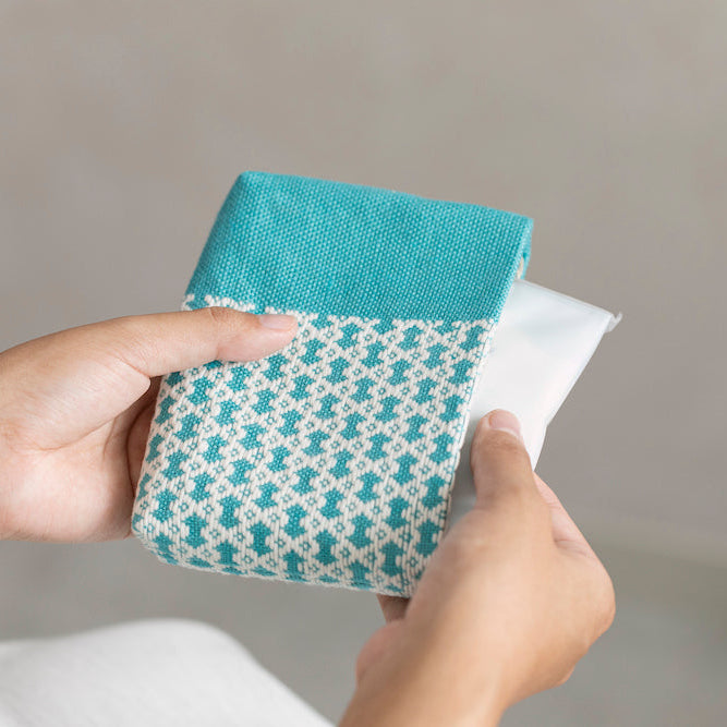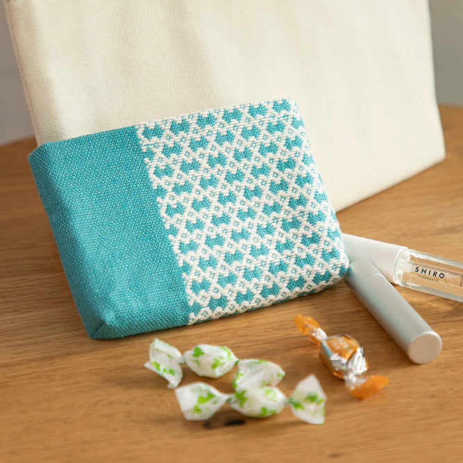 紹介するポーチは、そんな「弘前こぎん研究所」と、東北6県に伝わるものを丁寧にセレクト・紹介する「東北スタンダードマーケット 」が手を取り合って作ったもの。「弘前こぎん研究所」で作られた図鑑の中から選んだ模様を鮮やかな水色の生地に展開し、生まれたアイテムは「淡雪」と名付けられました。