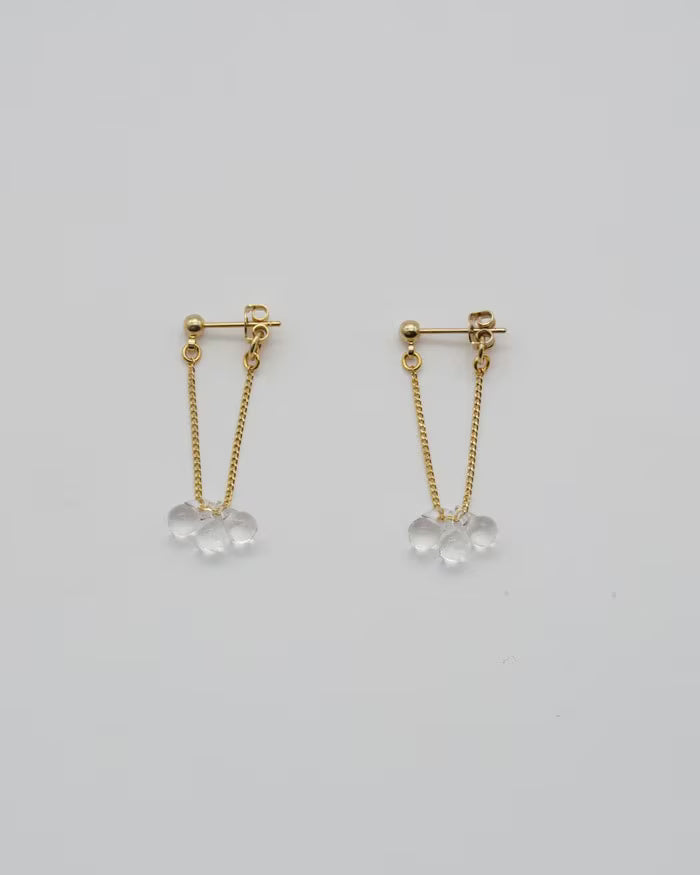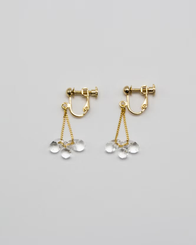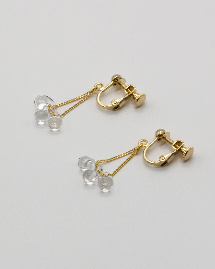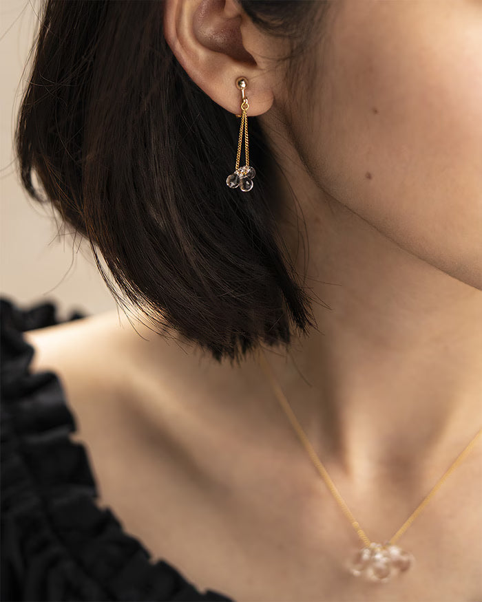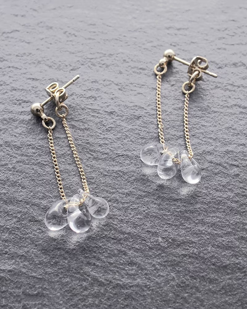 小さなしずくが連なるように見える、ガラスのピアスとイヤリングです。ピアスはヘッドからキャッチまでチェーンでつながっていて、ガラスが耳元に立体的に見えるのが特徴です。動くたびにしずくが光を拾い、耳元に細い輝きが生まれます。
