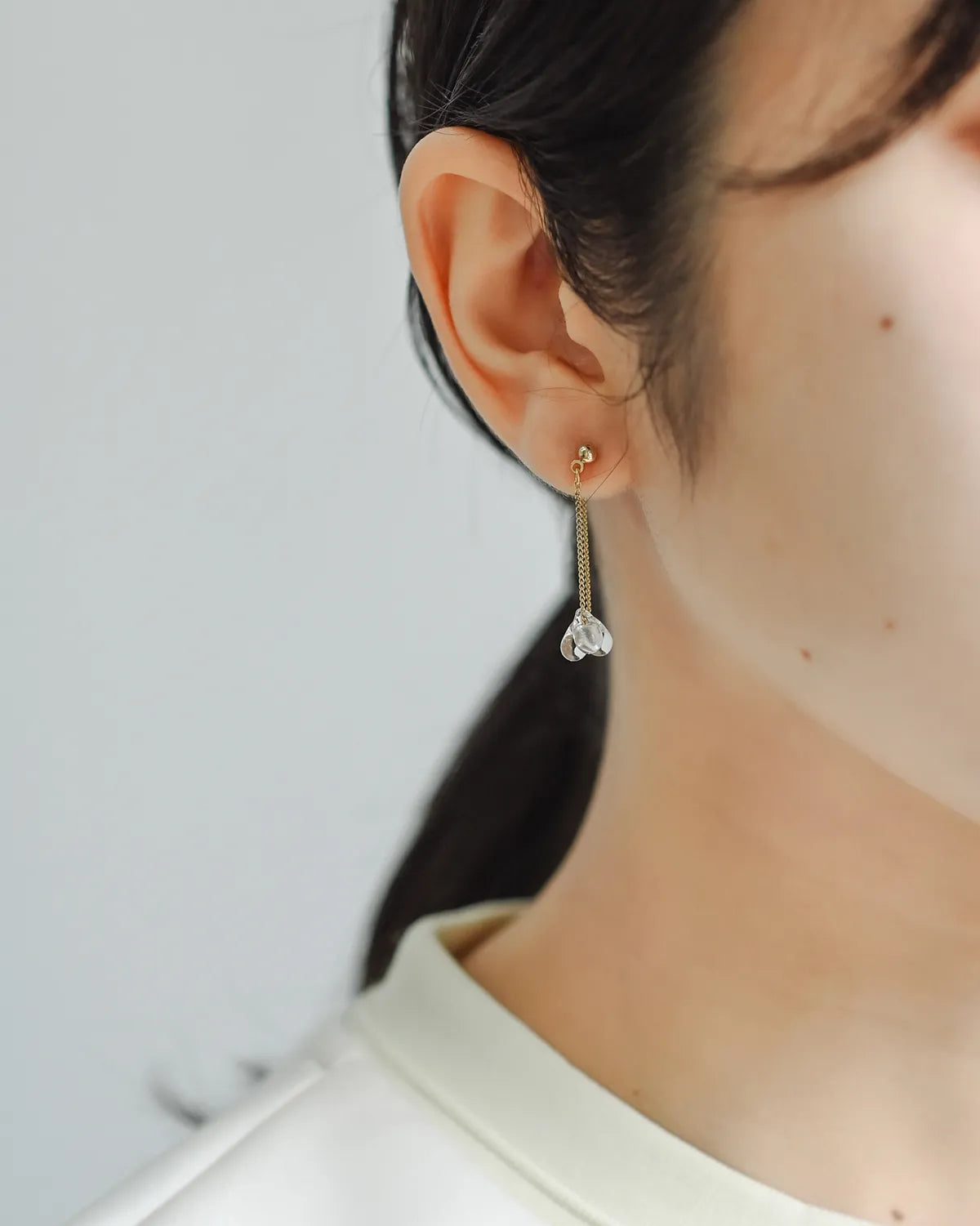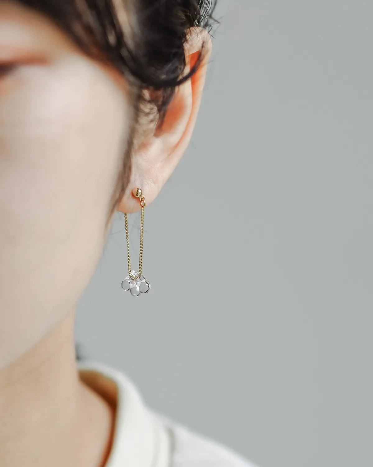 イヤリング装着イメージ。イヤリングでも、しずくの繊細な揺れ方はそのまま。耳元にほどよい動きが出るので、きれいめの装いにも合わせやすいデザイン