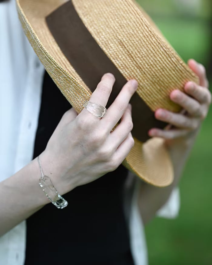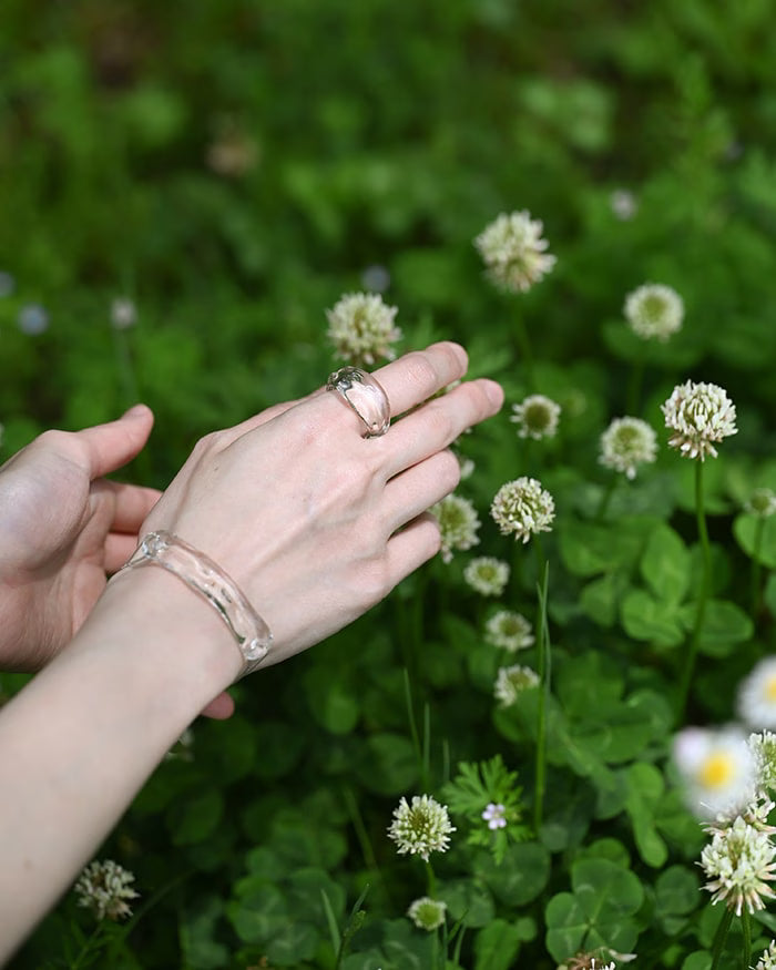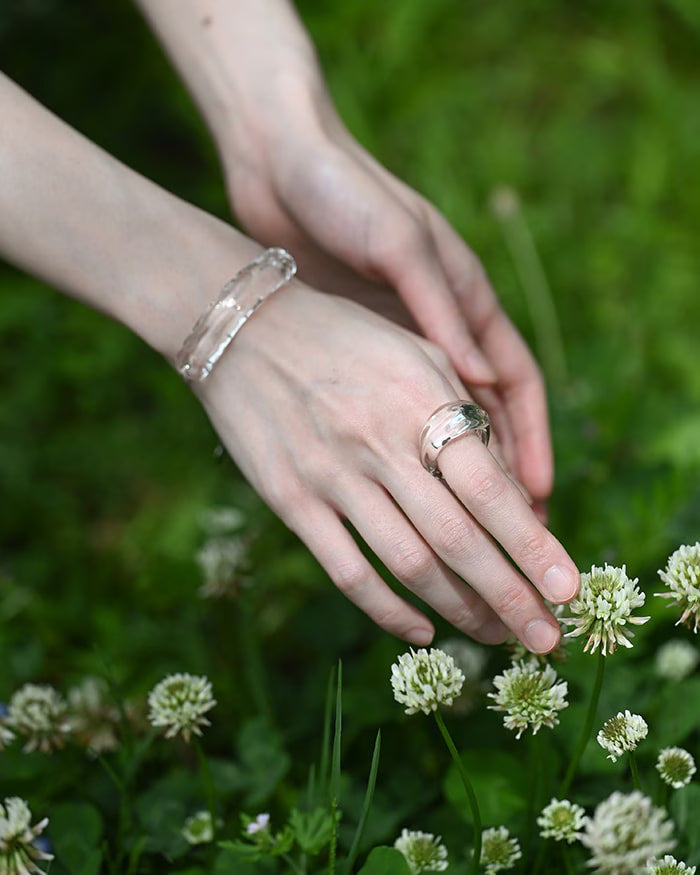 リングの表面に刻まれた波のような起伏が、光をまっすぐではなく、流れるように見せてくれます。透明なガラスでありながら輪郭がぼやけず、手元にほどよい華やかさが出るのは、この線の動きがあるからです。