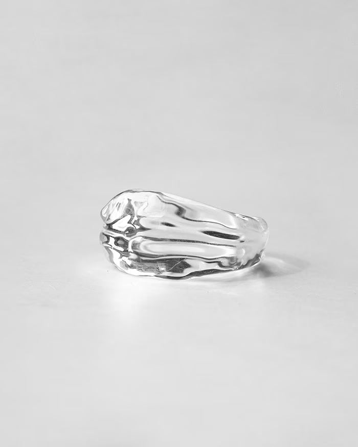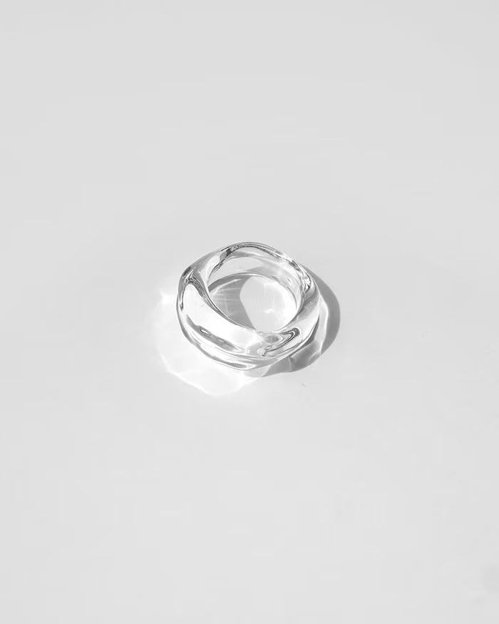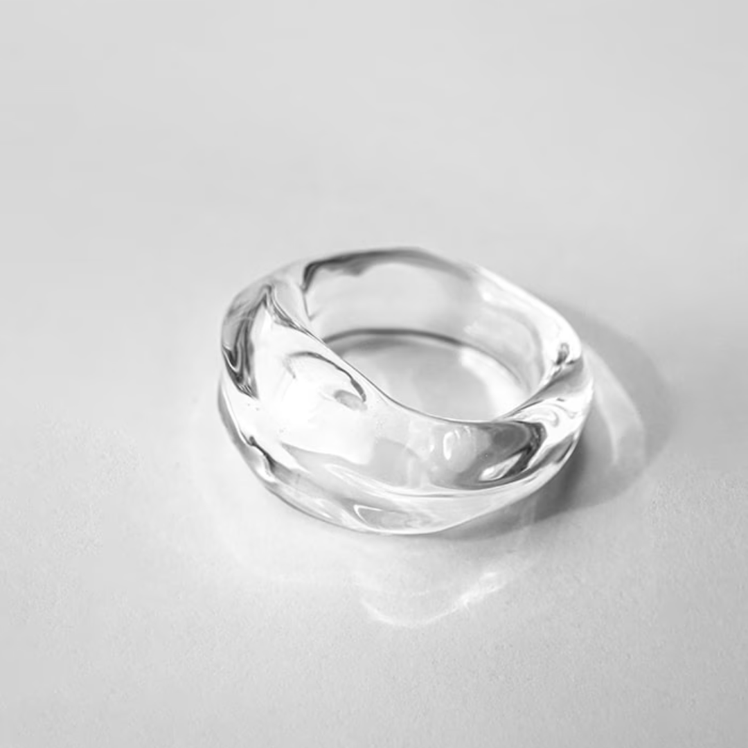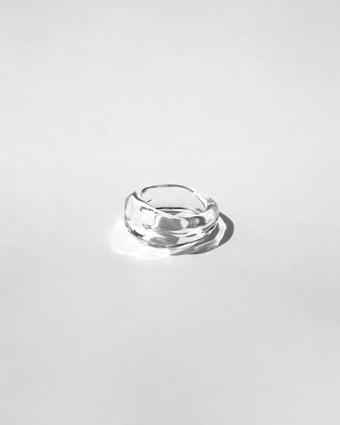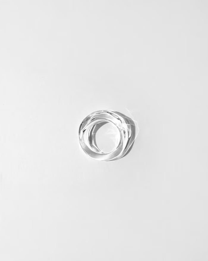 水が流れ、そのまま固まったようなガラスのリング