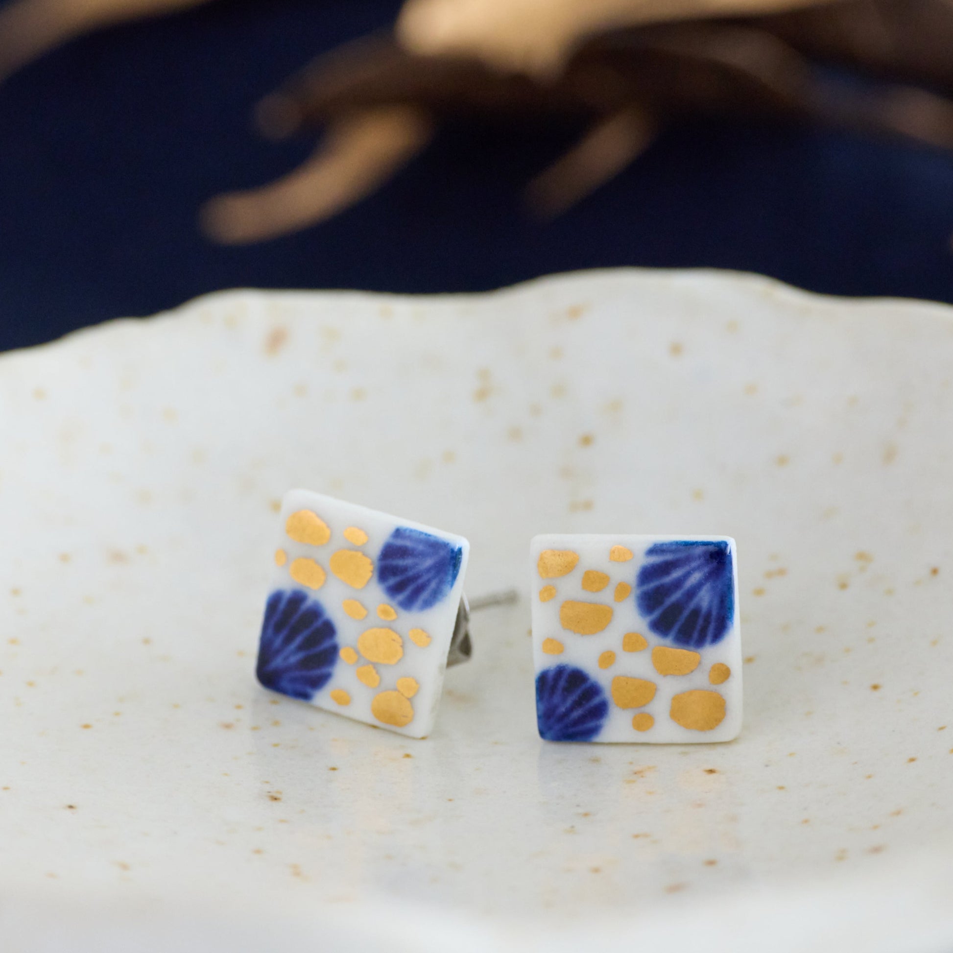 小さくて、清楚なイメージの染めつけのピアス・イヤリング。小さなタイルに、呉須と金彩を使って職人がひとつひとつ筆で絵を描いています。金の部分は釉薬によって高く盛られいるのが特徴的です。白と青のコントラストが、清涼感を漂わせます。
