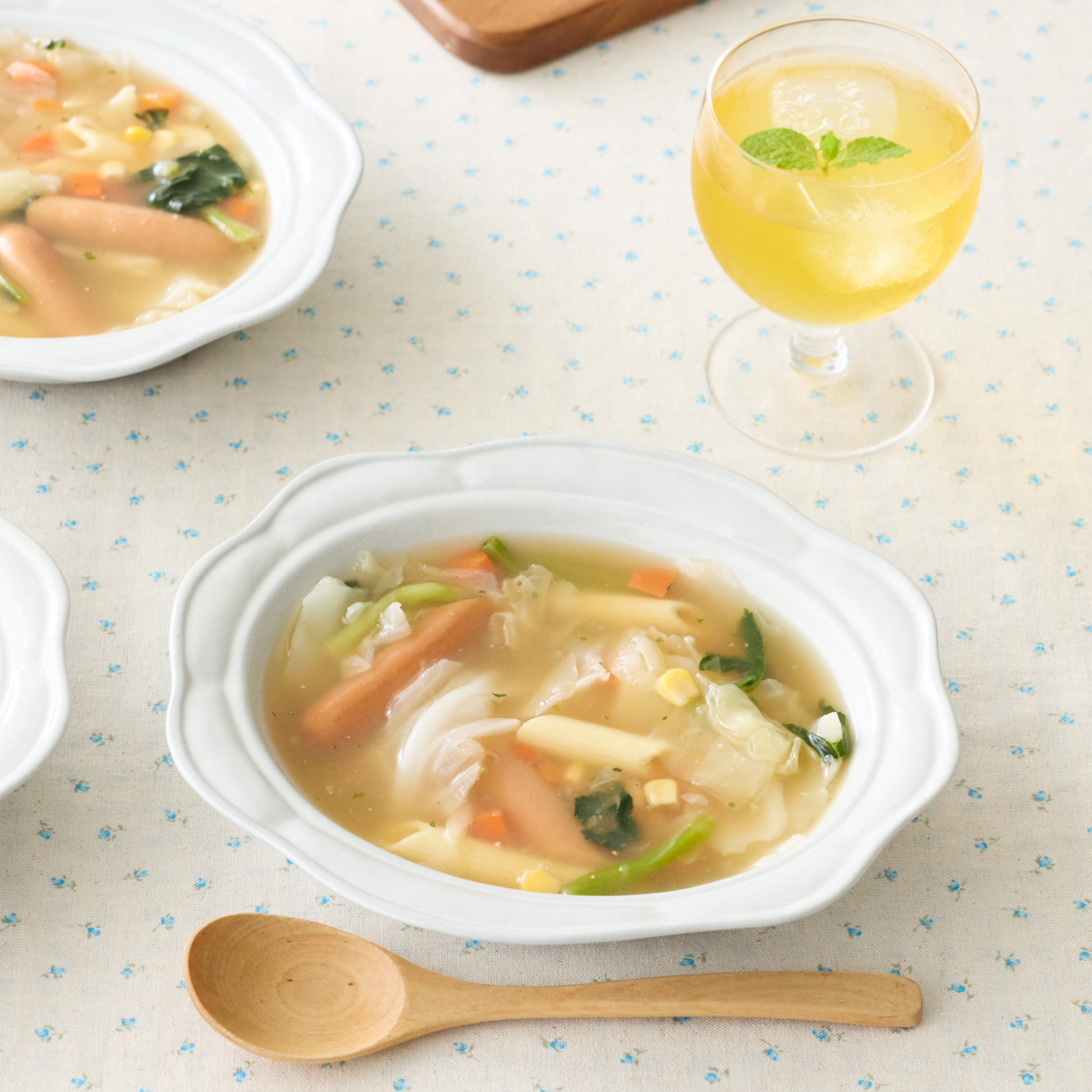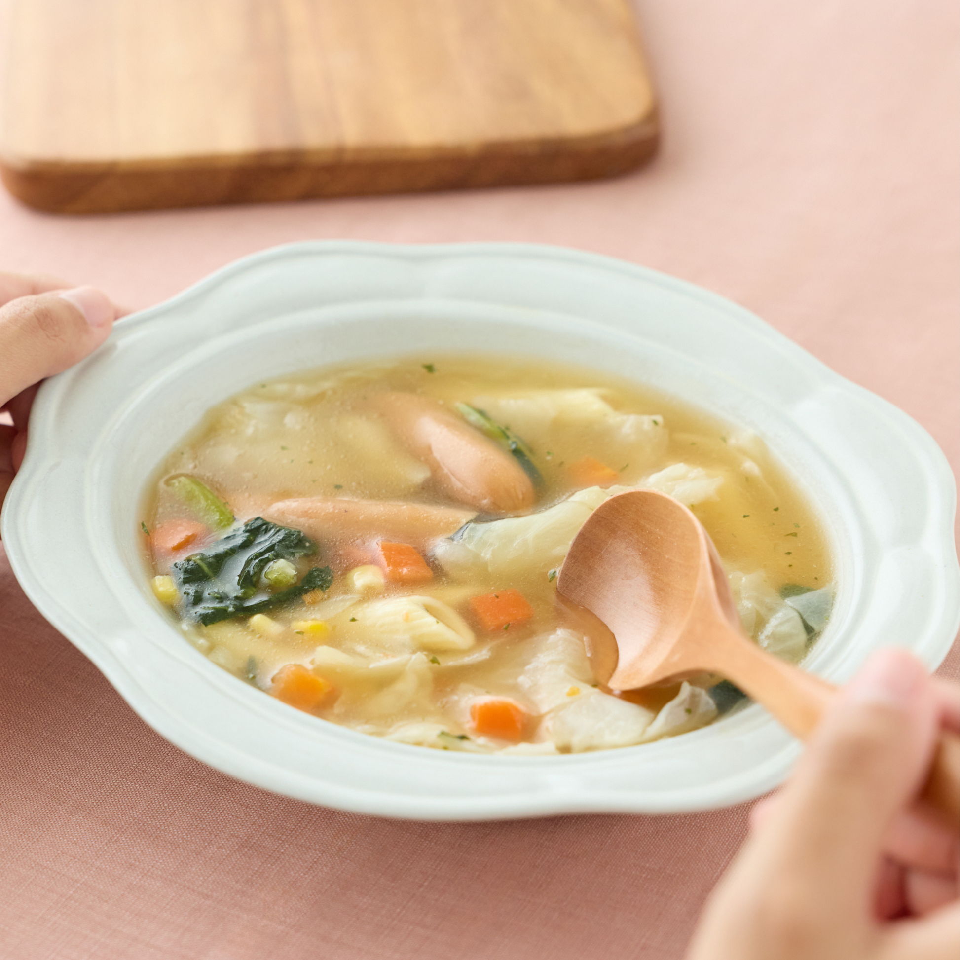 この儚げな色合いが、どんな料理もやさしく包み込みます。人参のオレンジ、葉野菜の緑、スープの琥珀色がふんわり映え、食卓全体がほんのり明るく上品な雰囲気に。特別な日だけでなく、いつもの朝ごはんやデザートにも気軽に使いたくなる、そんなやさしい存在感のある器です。