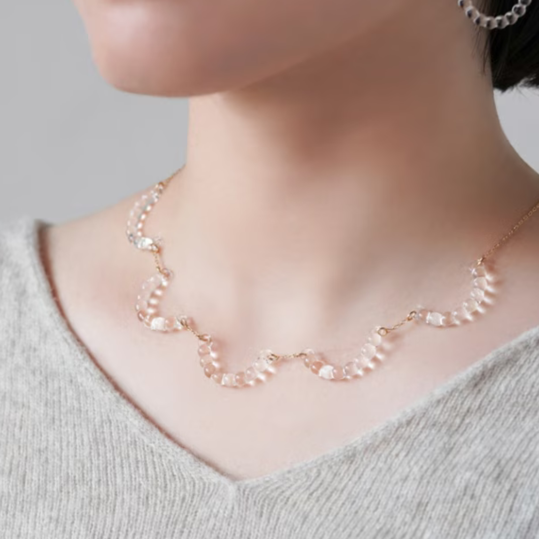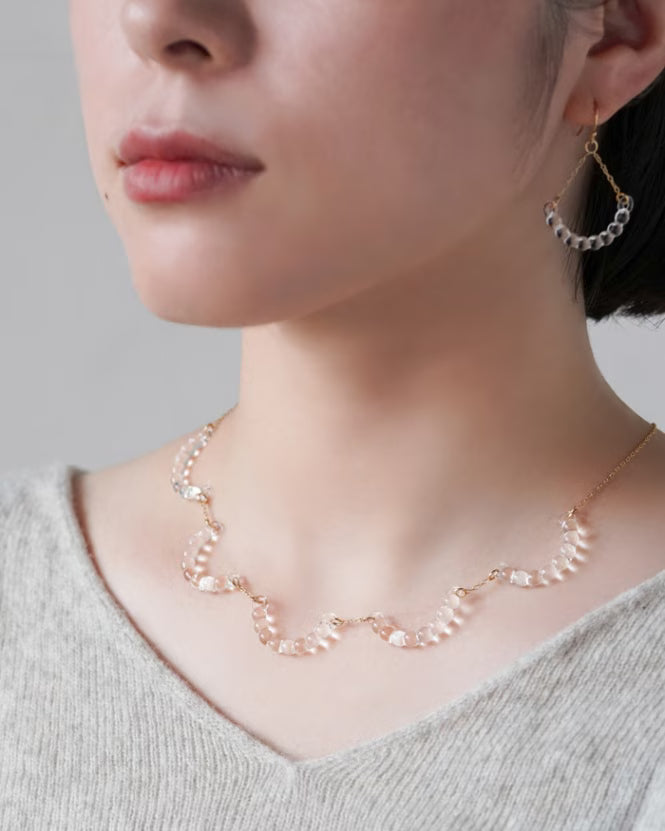 雨粒の連なりがやわらかな弧を描き、首元にレースのようなリズムを生みます。華やかさはありながらも、透明なガラスだから印象は軽やか。甘さに寄りすぎず、繊細なニュアンスで取り入れられるデザインです。