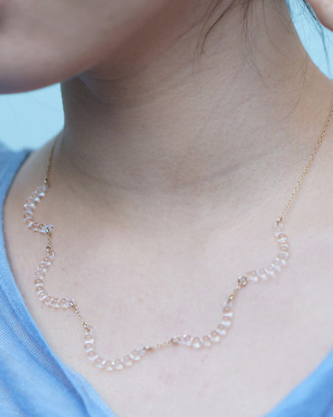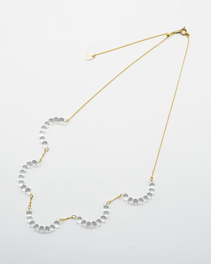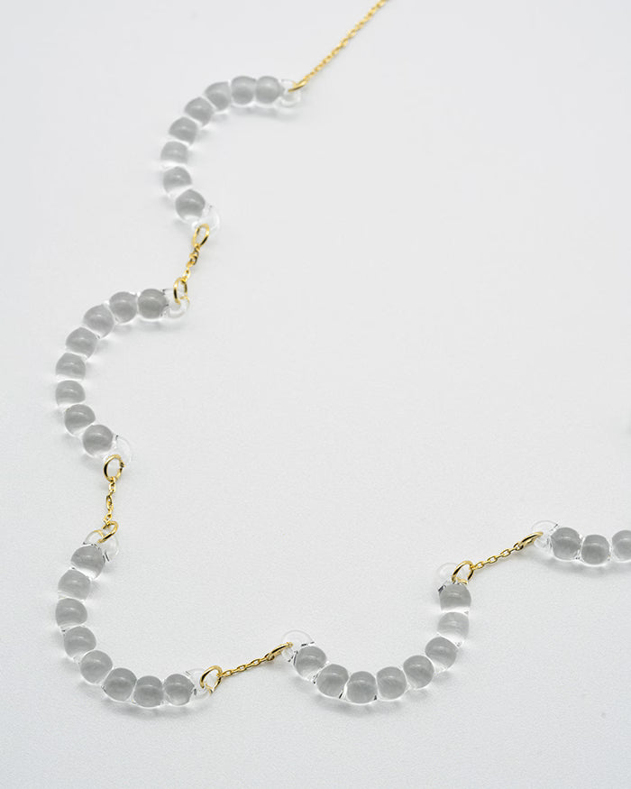 雨粒をつないだような繊細さが、首元にやわらかく映えるガラスのネックレス。しずく型の透明ガラスがゴールドのチェーンに沿ってゆるやかに連なり、レースのような軽やかな表情を描きます。光を受けるたびに小さな粒がさりげなくきらめき、デコルテにみずみずしい華やかさを添えてくれます。
