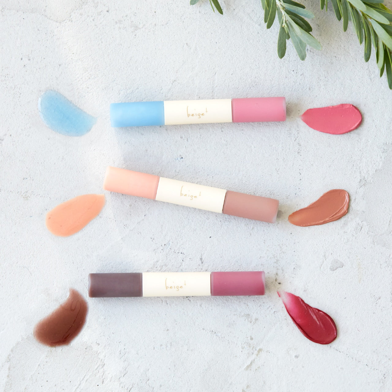 プランパー効果のあるグロスと、チークとしても使えるセミマットのリップがダブルエンドになっているので、単色使いだけでなく、重ね塗りによるニュアンスアレンジも楽しめます。