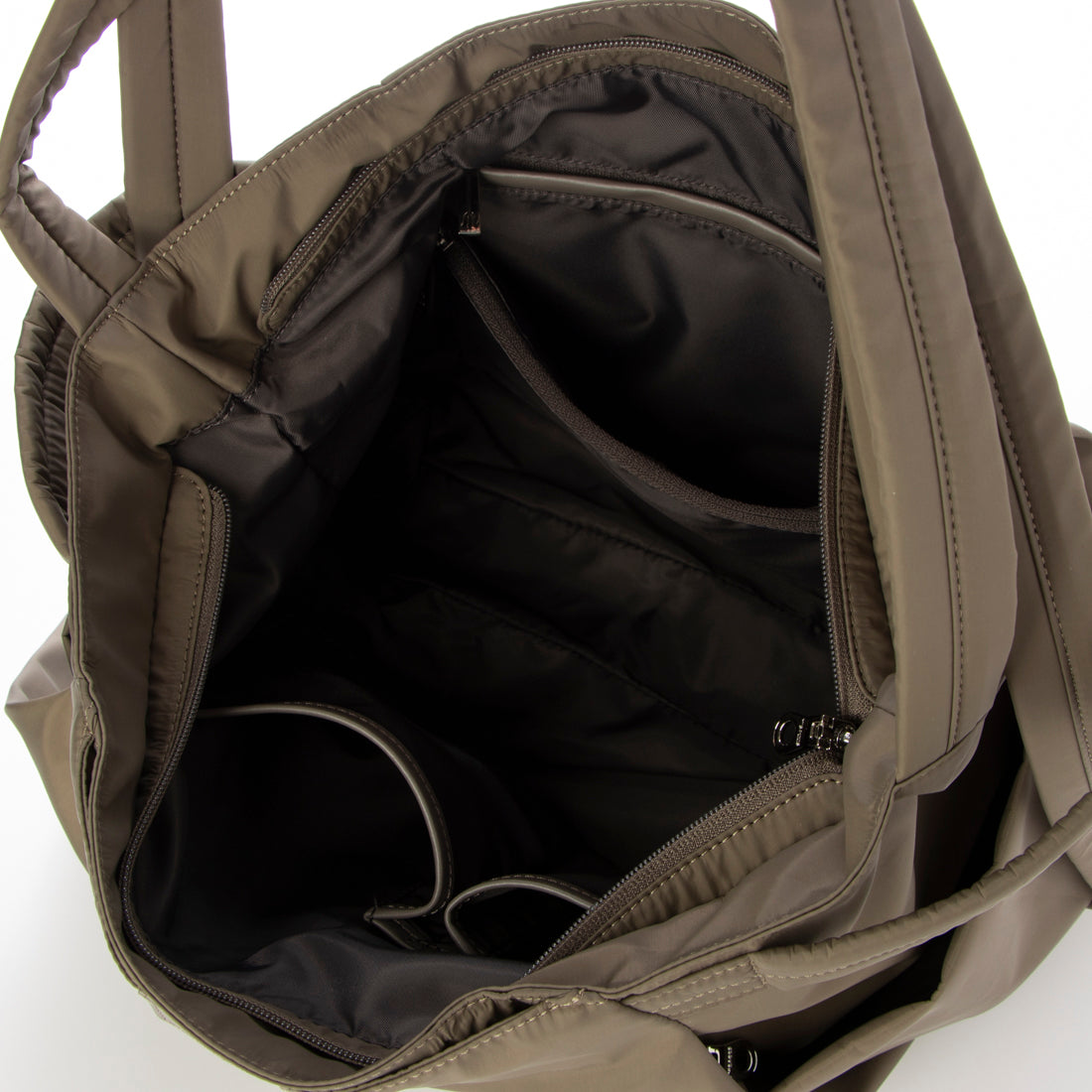 また、外側から内側に直接アクセスできるファスナーもあり、混雑した電車の中などで口を大きく開かずに荷物を取り出すこともできます。