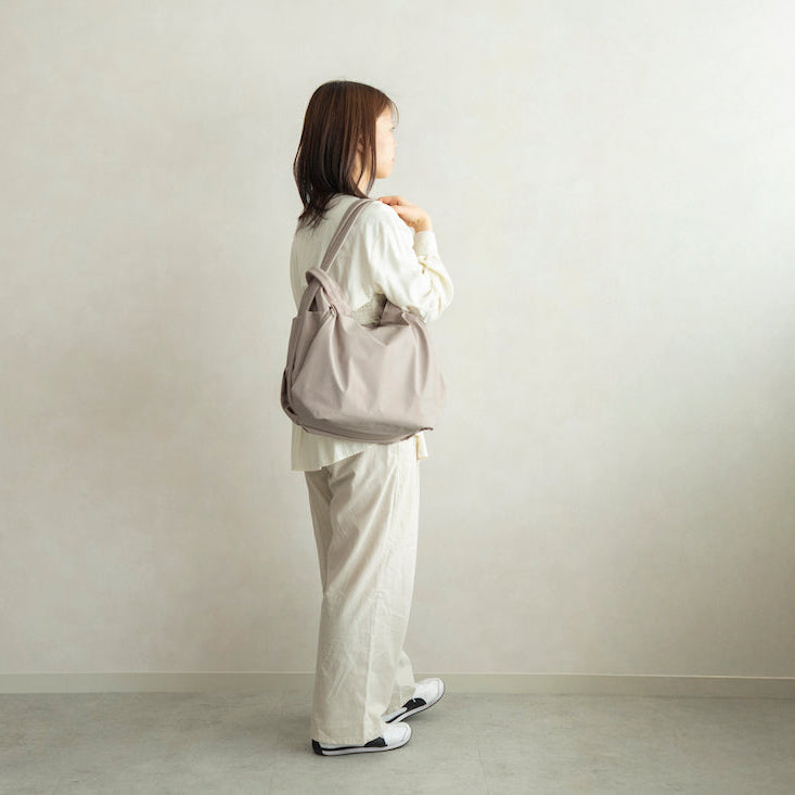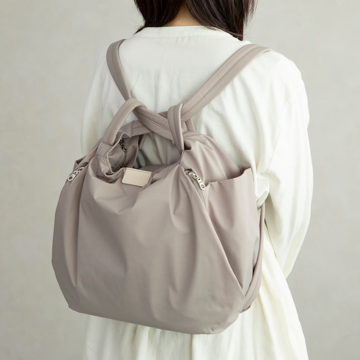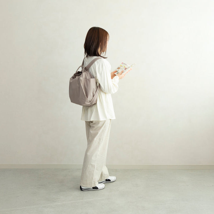 高密度で手触りの良い、撥水タフタ素材のナイロンバッグ。ショルダーとリュックの2WAYで使用できます。