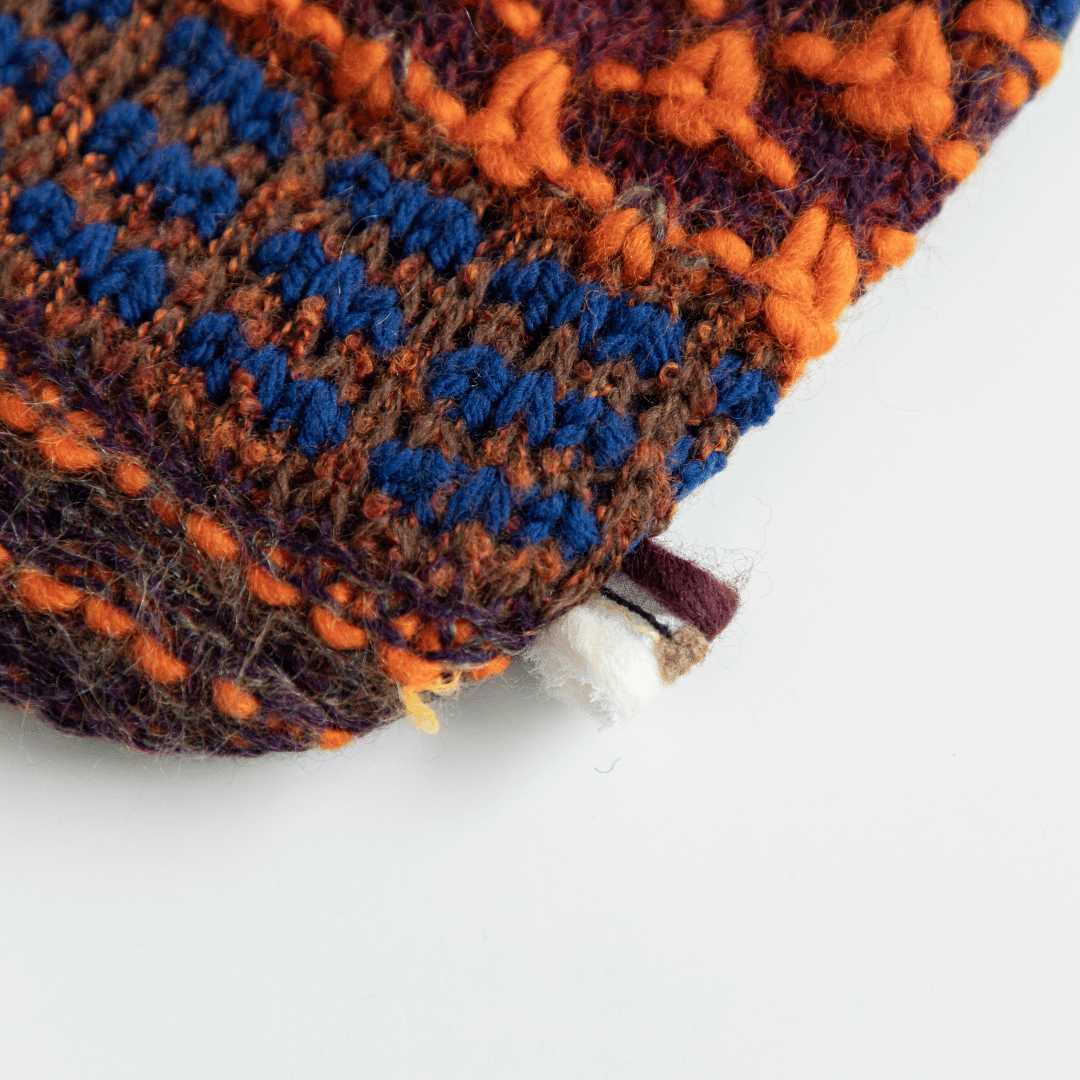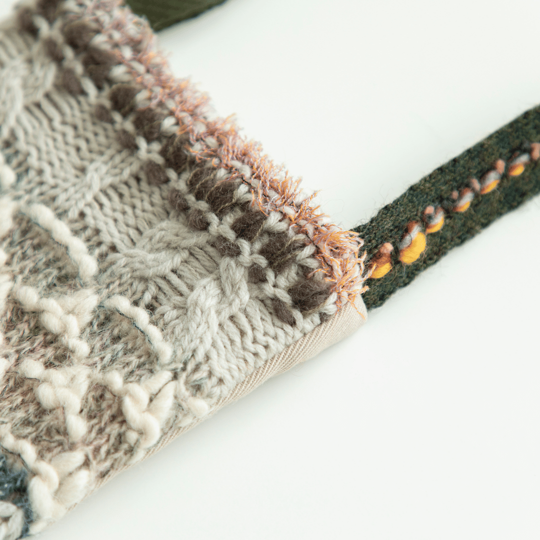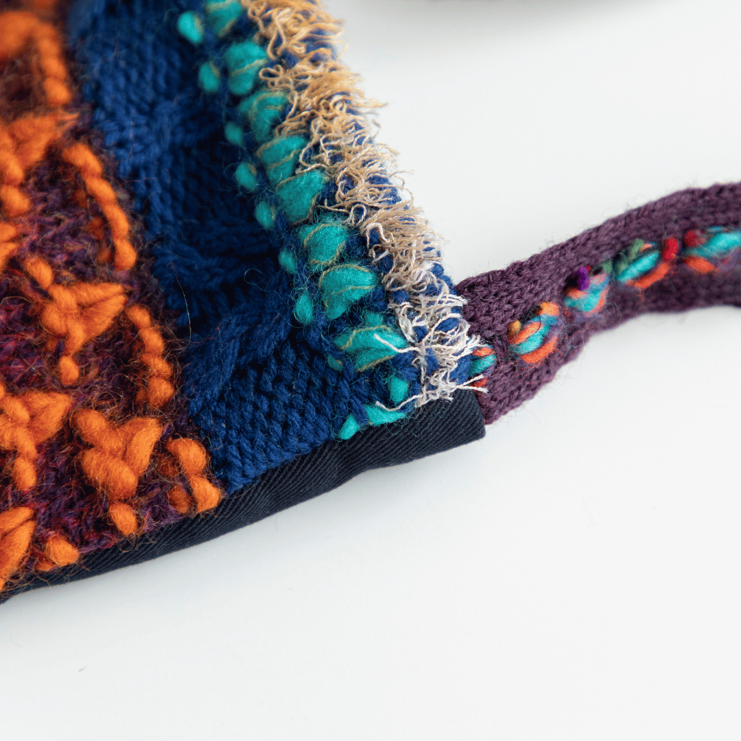 その特別な糸を使い、ジャカードや畦(あぜ)編みといった多様な編みのテクニックをパッチワークのように組み合わせることで、思わず触れたくなるような凹凸感のある立体的な表情に。手間を惜しまない手仕事から生まれる豊かな色彩は、秋冬のダークトーンになりがちな装いに、心華やぐアクセントを添えてくれます。