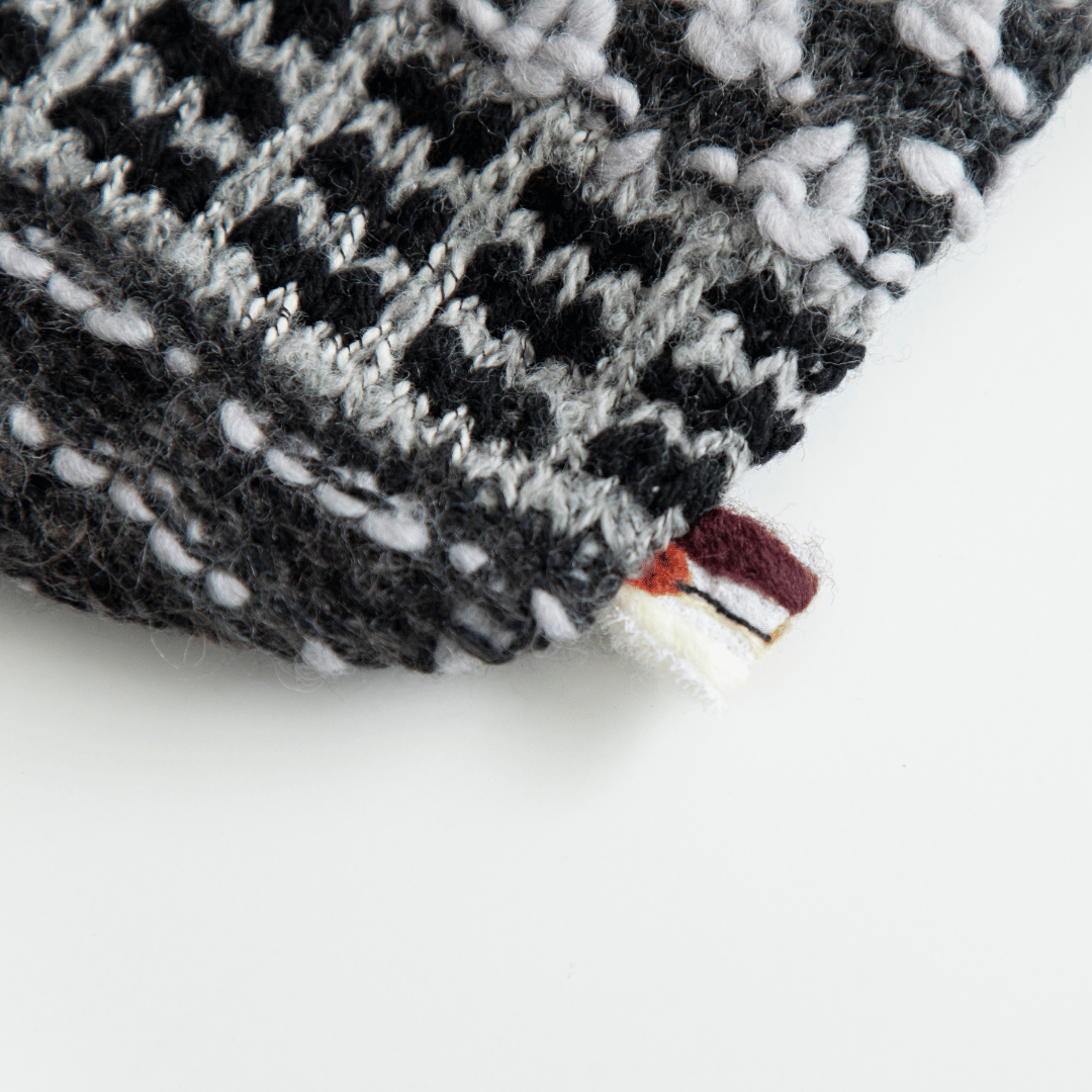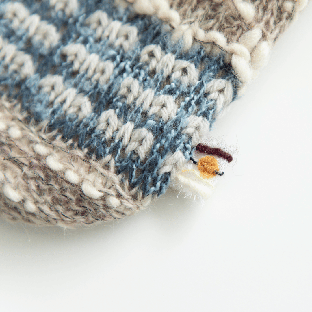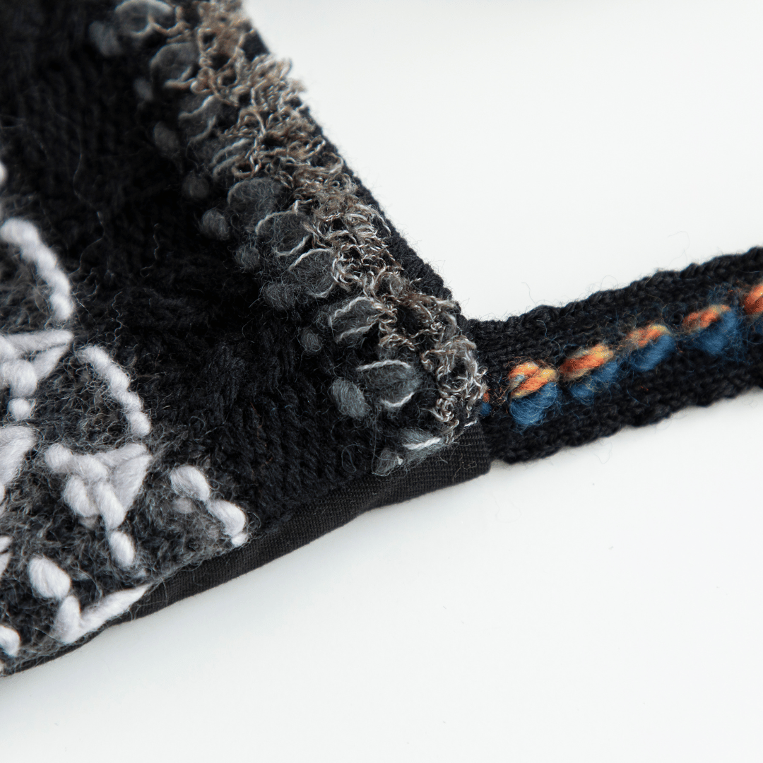 その特別な糸を使い、ジャカードや畦(あぜ)編みといった多様な編みのテクニックをパッチワークのように組み合わせることで、思わず触れたくなるような凹凸感のある立体的な表情に。手間を惜しまない手仕事から生まれる豊かな色彩は、秋冬のダークトーンになりがちな装いに、心華やぐアクセントを添えてくれます。