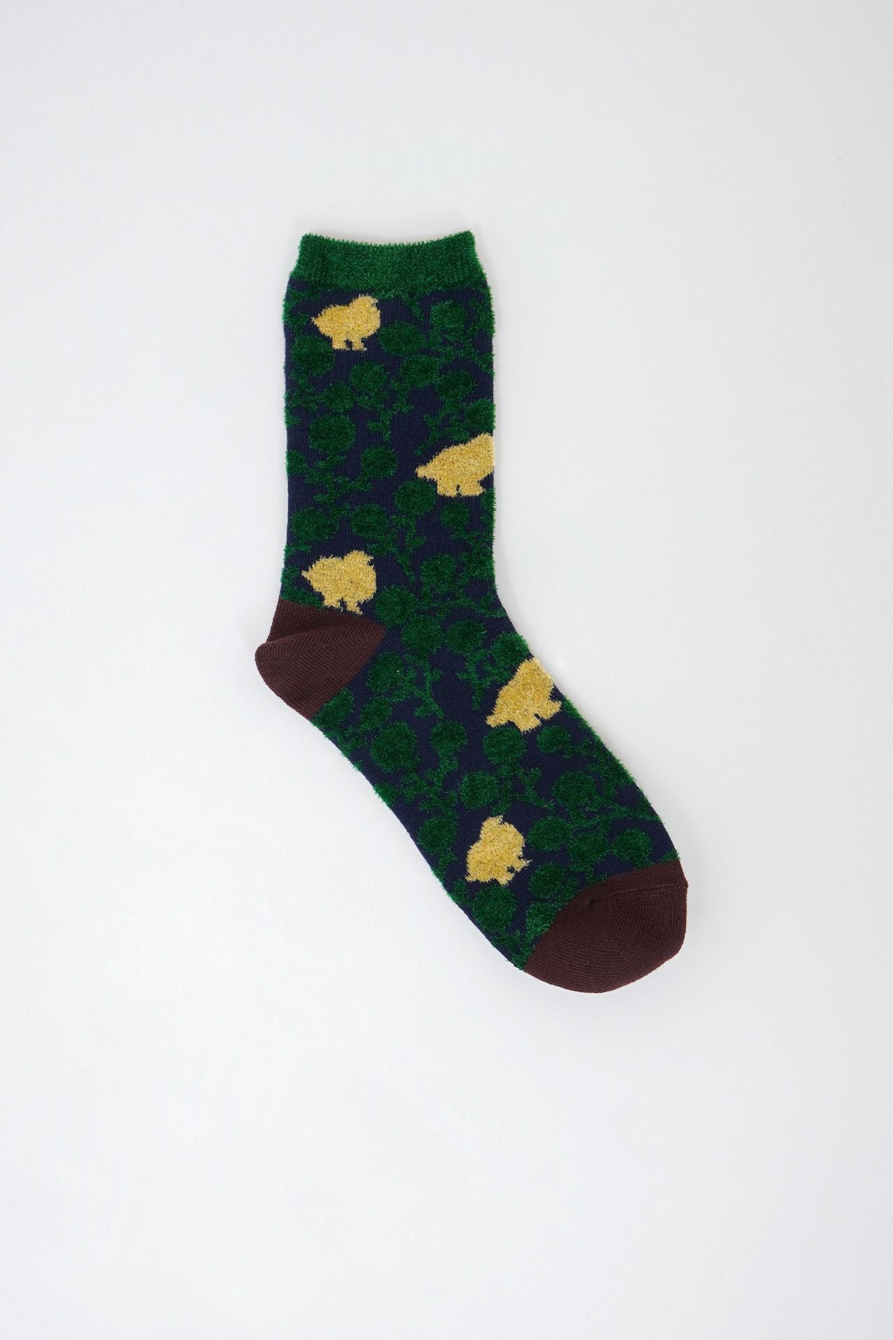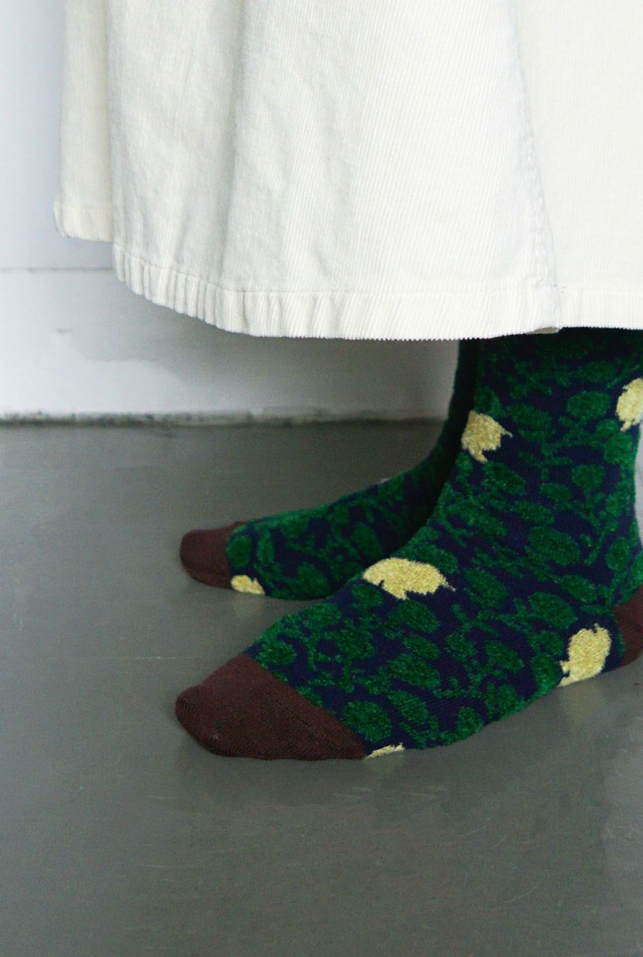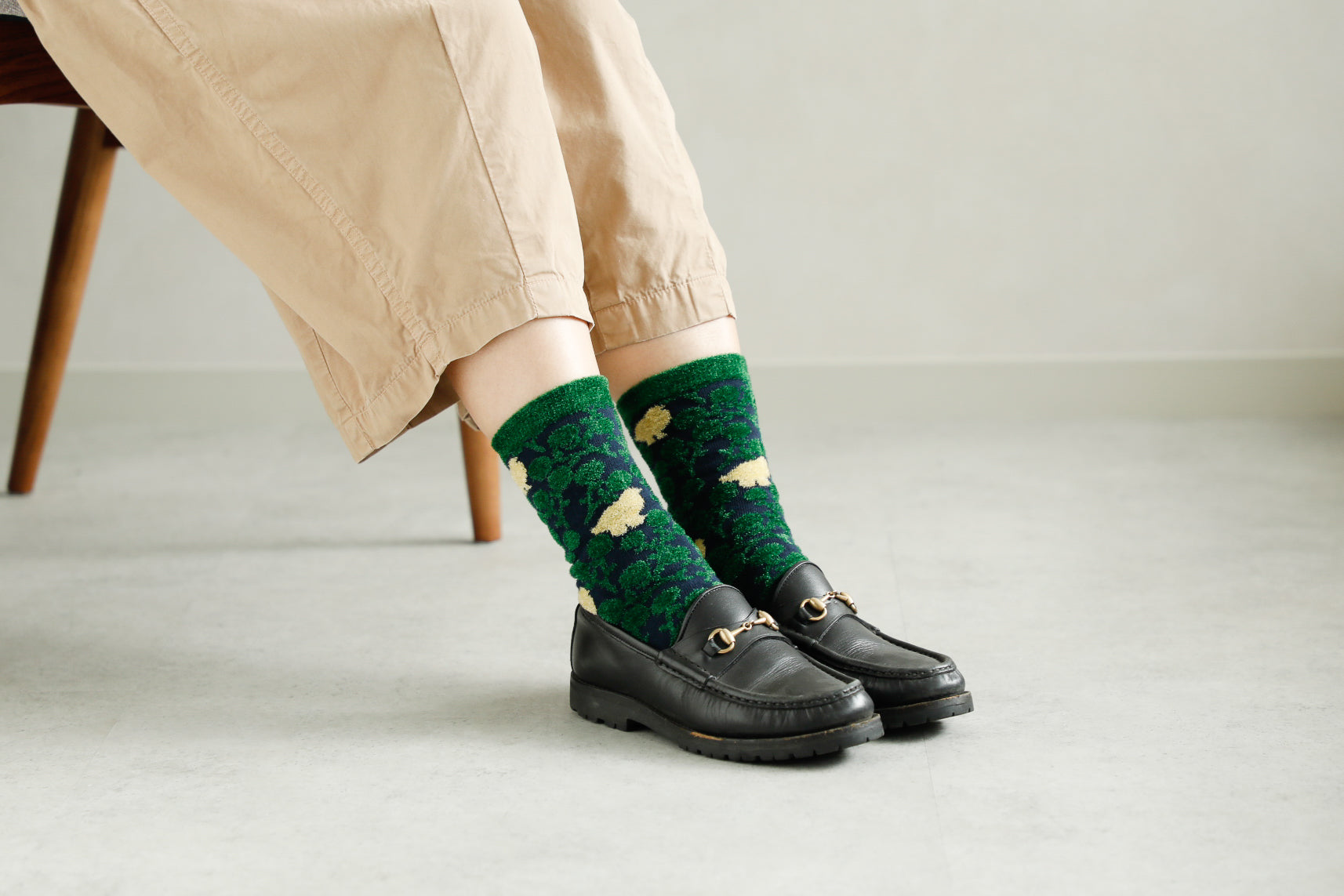 まるいシルエットのライチョウや木の実を、ふわふわとした表面感のあるジャガードで表現したソックスです。