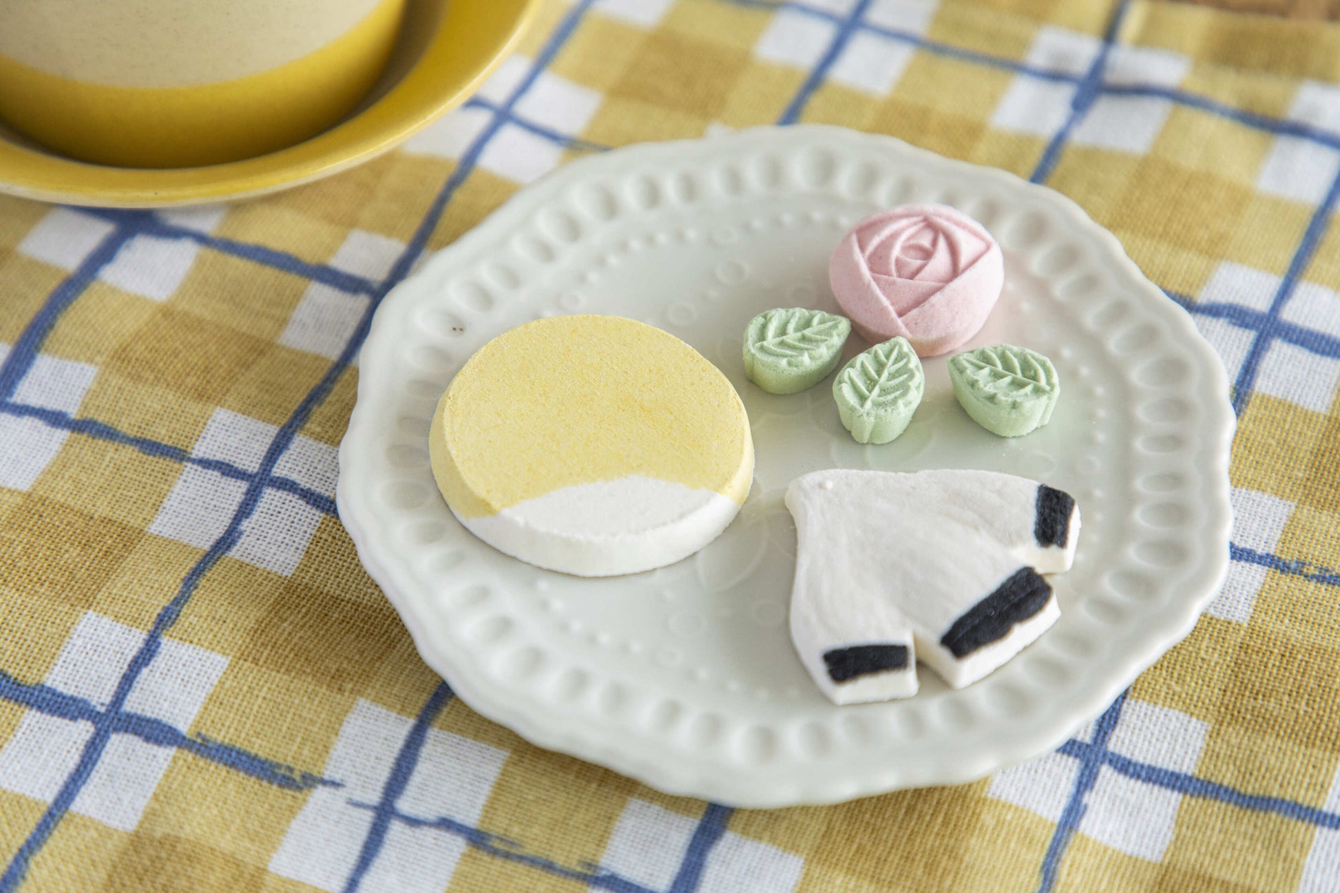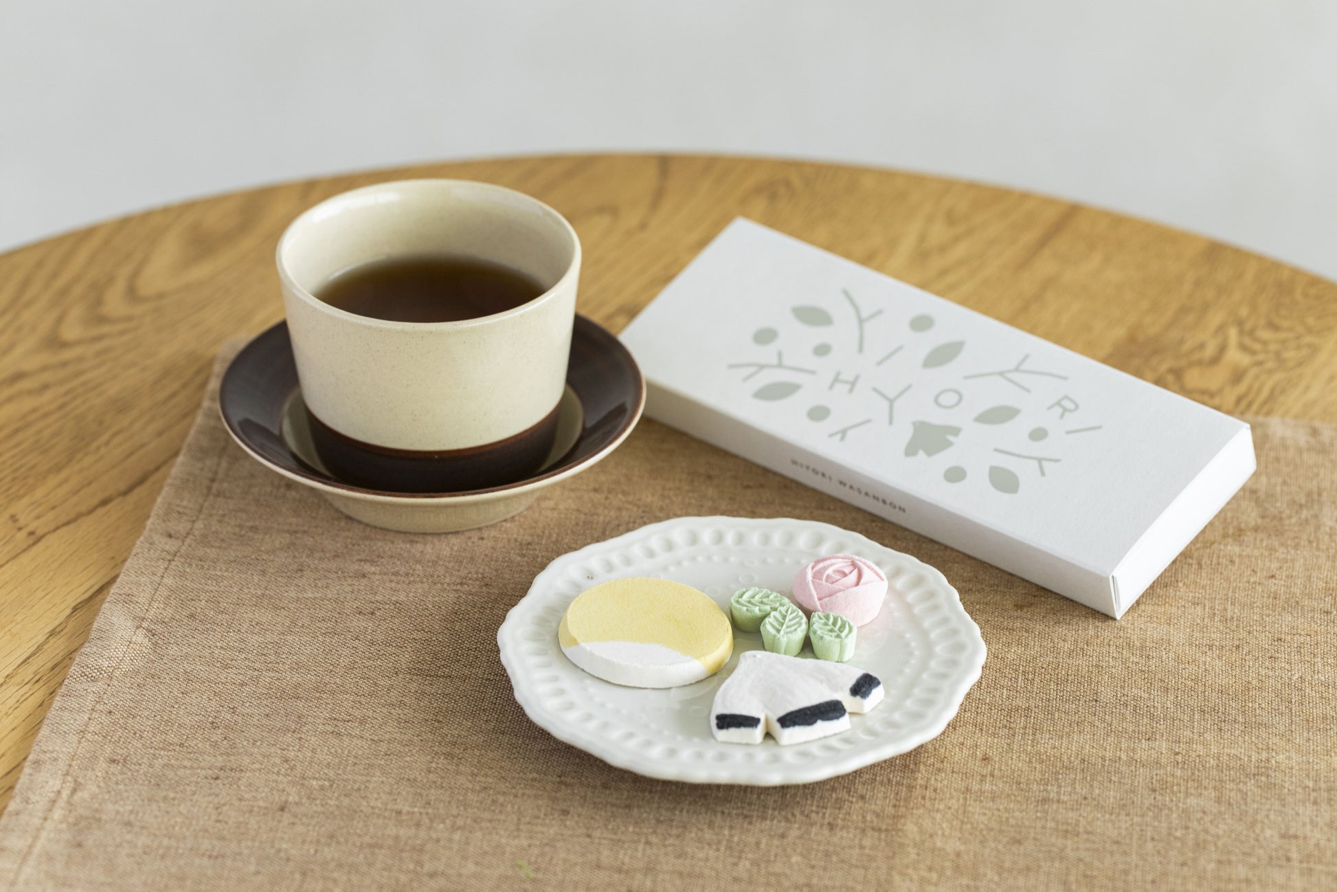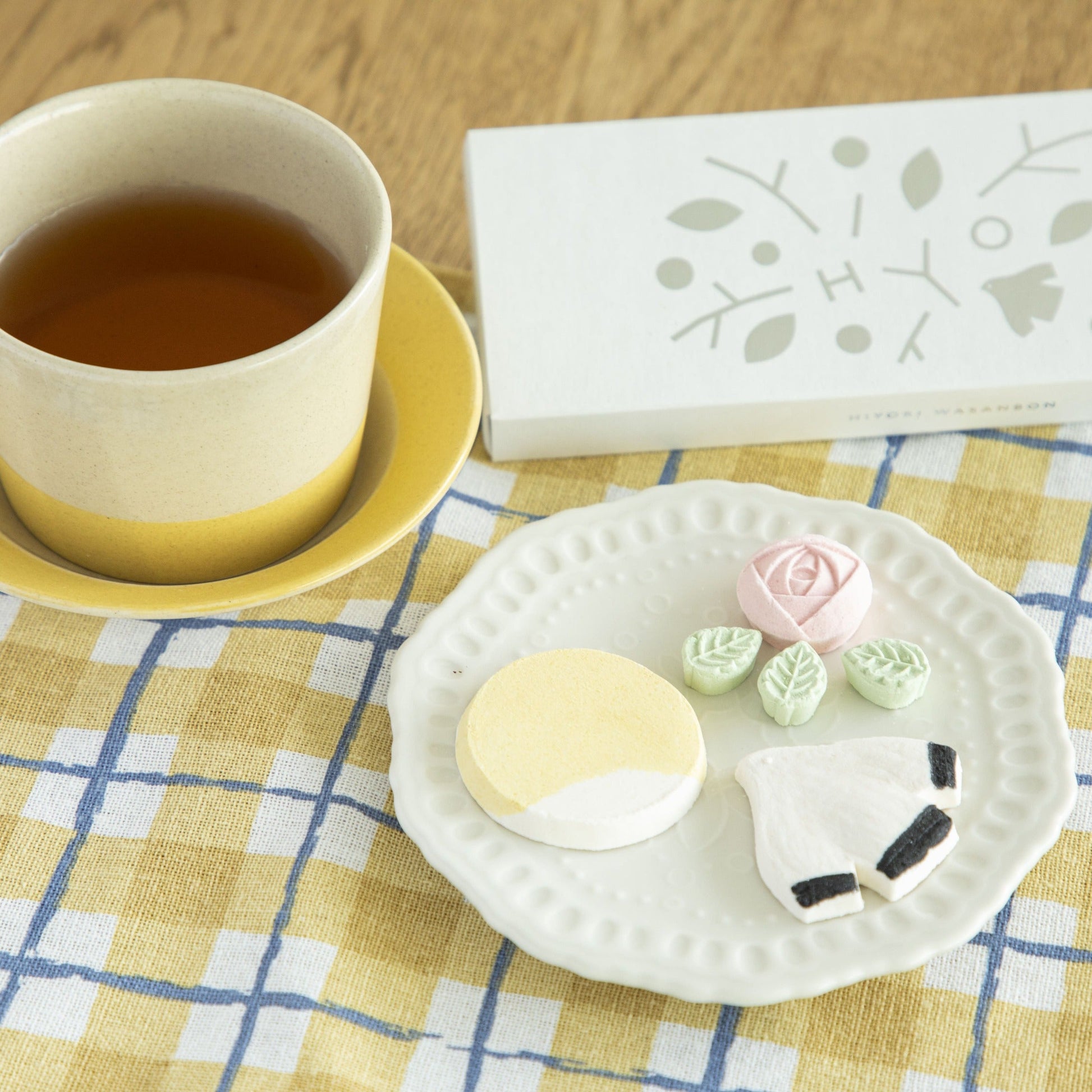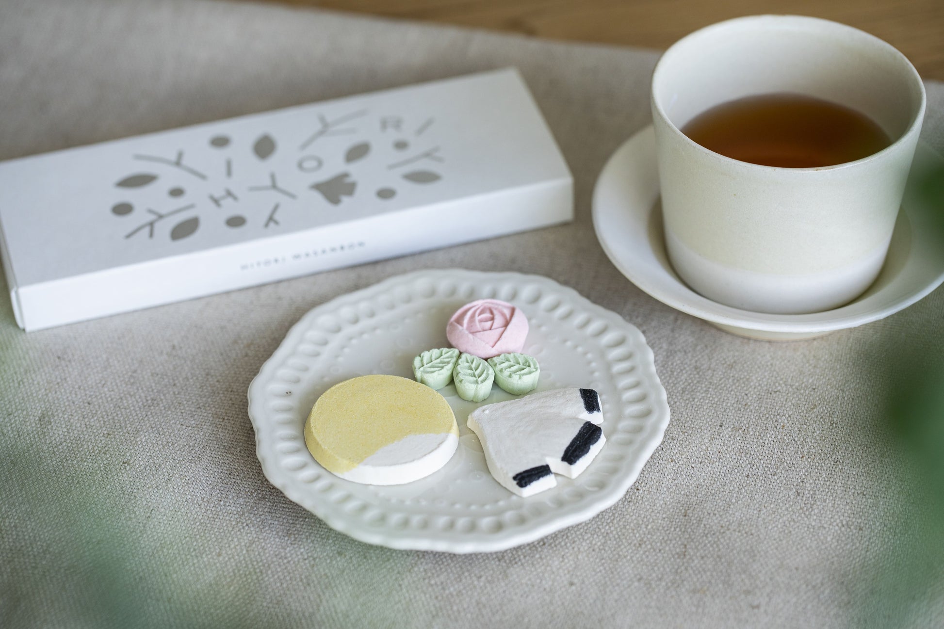 和三盆は3個入り。カモメはプレーン、バラはプレーン&すだち、お日様は瀬戸内レモン。ひと粒ごとに香りの方向が変わるから、甘さの印象が単調になりません。まずはそのまま、さらりと溶ける口どけを。次は器にのせて、眺めてからひと口。食べる前の数秒まで、うれしくなる和三盆です。