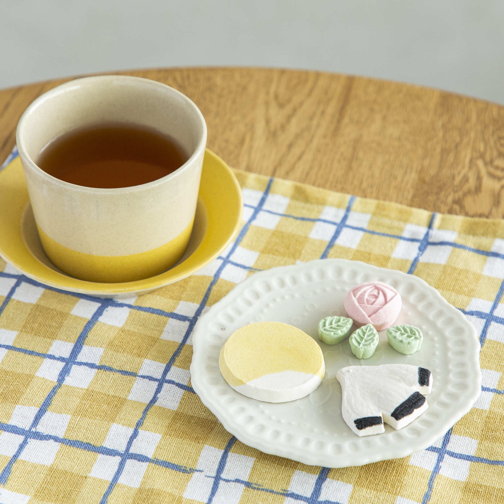 電子レンジや食洗機に対応しているので、気負わず毎日気兼ねなく使えます。色は「藤黄」「白雲」「鳶色」の3種。藤黄は透明釉のつやの中に土の素材感がのぞき、白雲はマットな絵付けで雲のようにやわらかく、鳶色は透明釉の光沢と深い色合いでレトロな雰囲気に。どれも土の素材感がきれいに見える仕上げで、和三盆のやわらかな色とも相性がいい。